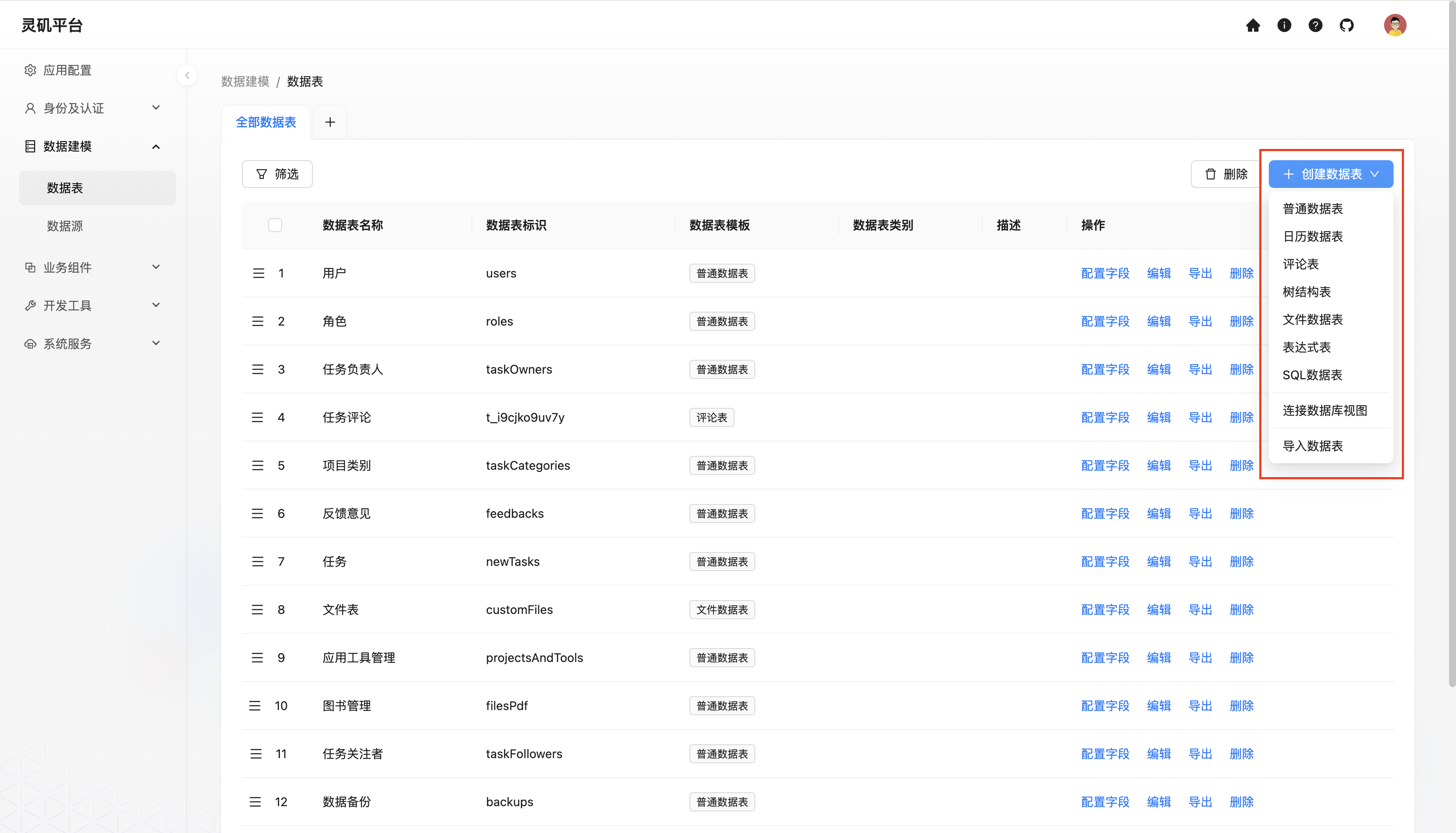 支持简洁的数据表管理界面: 用于创建各类数据表或连接已有数据表。